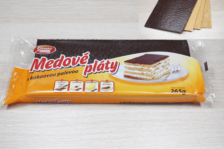 Medové pláty s kakovou polevou s posypom 270g. Polotovar na výrobu zákuskov Cukrársky korpus. Jemné pečivo.